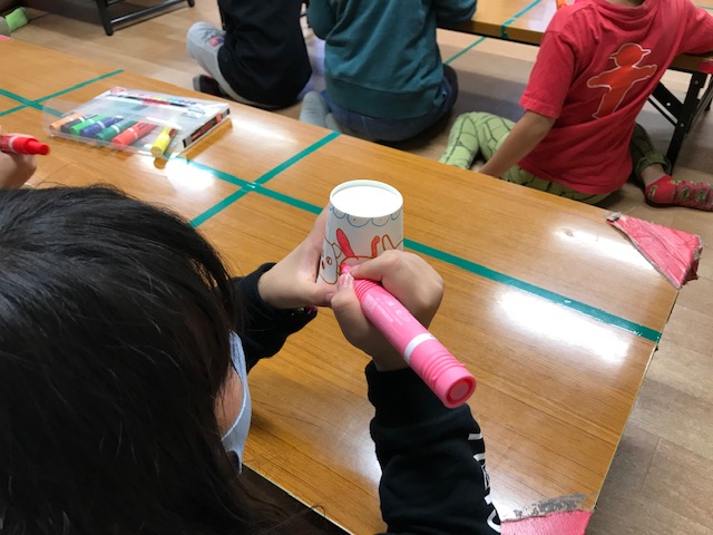 大阪成蹊大学芸術学部 美術・アート表現コース/表現教育コースの学生で構成された「Arcticchi(アーチッチ)」のメンバーから説明を受けて、子どもたちの制作スタート! 白い紙コップにマジックで自由にぬりぬり。ハロウィンにちなんでかぼちゃのモンスターや大人気アニメの着物の柄などを描いてくれる子どもたち。みなさん、楽しく取り組んでくれました!