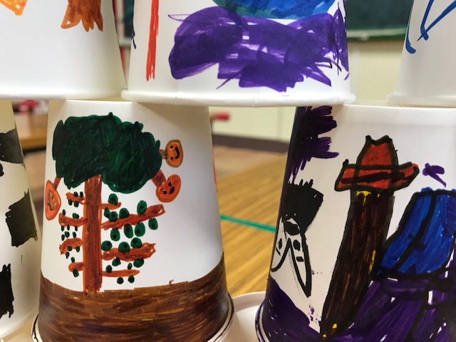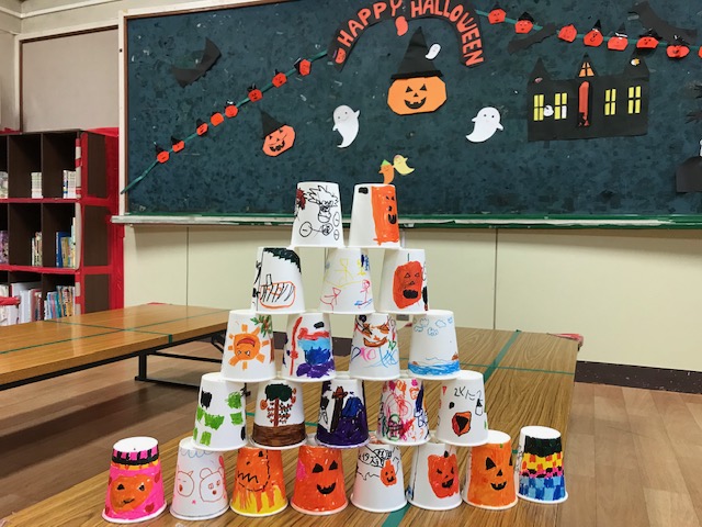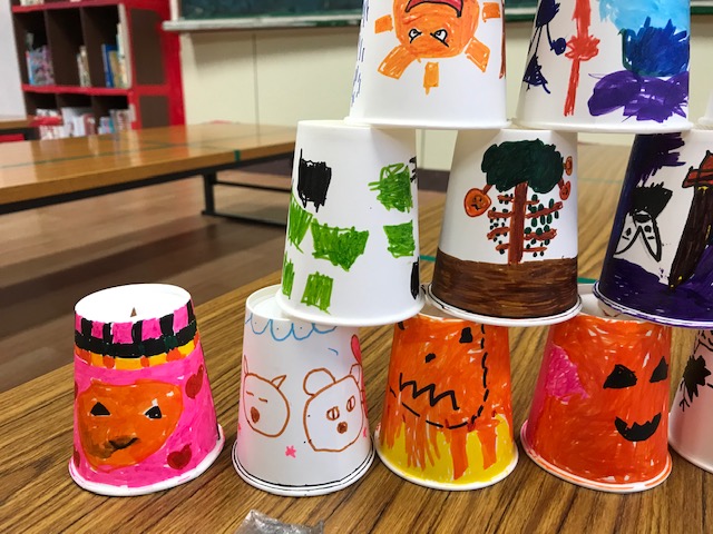 さて今回は、10/31(土)から大阪成蹊大学が繰り広げる展示「恐怖!ドキドキ怪コップLAB」に飾り付けられる怪コップ(紙コップ)を地域の子どもたちにも作ってもらおう!ということで、野田小・庄内小放課後こどもクラブにおじゃまいたしました!