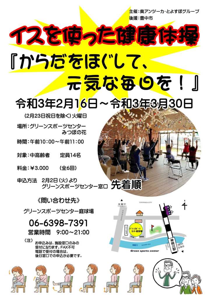 2・3月も、火曜日は健康体操! 投稿者:Toyonaka_Art_Project2021年1月22日2021年9月2日カテゴリー:未分類 「笑顔で楽しく体を動かせる広場」を目指すグリーンスポーツセンターでは、毎週火曜日午前10時から11時まで、イスを使った健康体操を実施しています。 センター内のウォーキングや散歩と合わせて、気軽にご参加ください! Tweetいいね 読み込み中… 関連