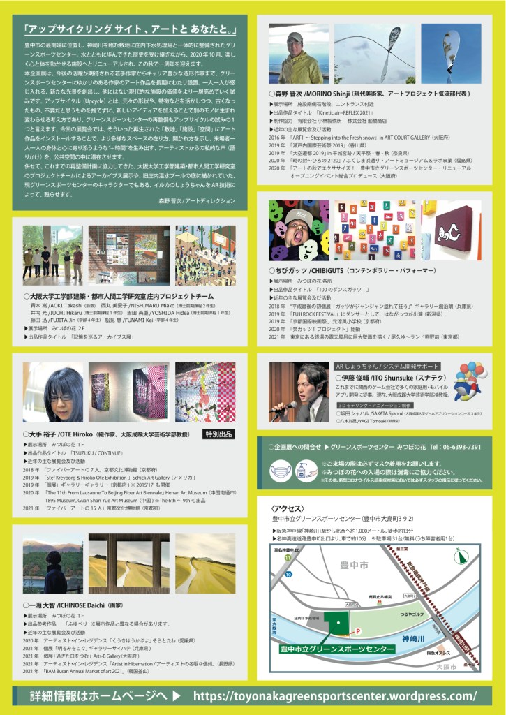 ◯展覧会期間 2021年10月1日(金)〜2022年3月31日(木) ◯場所 みつぼの花、南側石階段エントランス、ウェルネス広場 ◯開館時間 9時〜21時 ※入場無料 (休館日 12月28日〜1月4日) ◯出品作家(五十音順) 一瀬 大智(画家) ちびガッツ(パフォーマー) 森野 晋次 (現代美術家、アートプロジェクト気流部代表) ◎特別出品 大手 裕子(織作家、大阪成蹊大学芸術学部教授) ◉企画プロジェクト 大阪大学工学部 建築・都市人間工学研究室 庄内プロジェクト ARしょうちゃんプロジェクト
