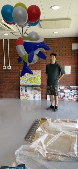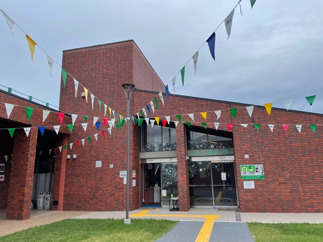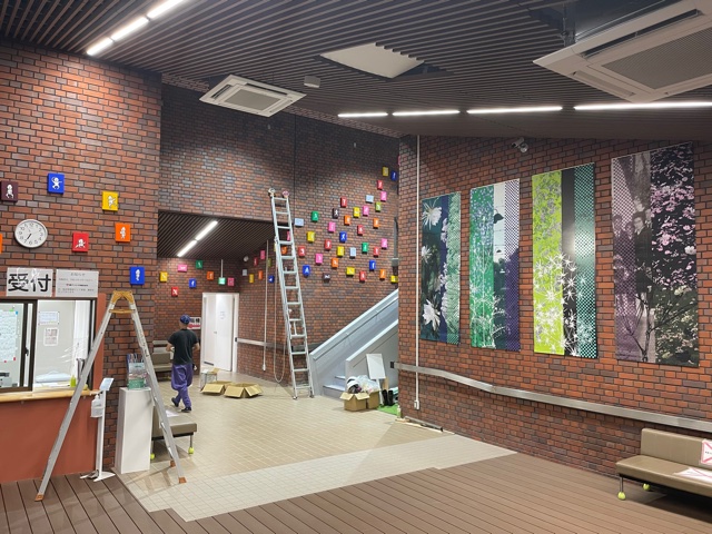 会場全体には皆さんをお迎えする旗がお目見えし、みつぼの花の館内ではアート作品の設営が出品者によって急ピッチで進んでいます