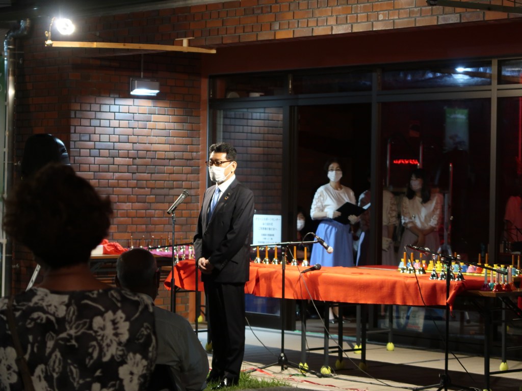 ご来賓として地域を代表する方々、主催者側からは豊中市長、四国大学学長のご出席のもと、ライトアップ「みつぼのヒカリカナデ♪」の点灯式をテープカット式に、LEDシステムに直結する導線をカットすると、光の色が音階に反応しだすという「点灯反応式」を行いました。