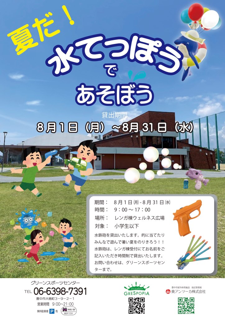 こんにちは、マンスリーイベント担当の竹花です。 連日の猛烈な暑さの中、みなさまどのようにお過ごしでしょうか。 さて、この暑さをぶっ飛ばし、夏を楽しみましょう!!! <8月企画> 夏だ!水てっぽうで遊ぼう グリーンスポーツセンターでは、8月1日(月)~31日(水)までの1か月間、みつぼの花の受付窓口にて、水てっぽうの貸出しをしています。 対象は、小学生以下 貸し出し時間は9時~17時の間 夏真っ盛り、暑さを吹き飛ばしにグリーンスポーツセンターにGO! 週末は、スタッフに声掛けてみてください。 タイミングよければ、水てっぽうを使ってのゲームやお楽しみがあるかも。 さあ、お友達誘ってグリーンスポーツセンターに遊びにいらしてください。 みなさま暑さに負けず、楽しい毎日を過ごしましょう。
