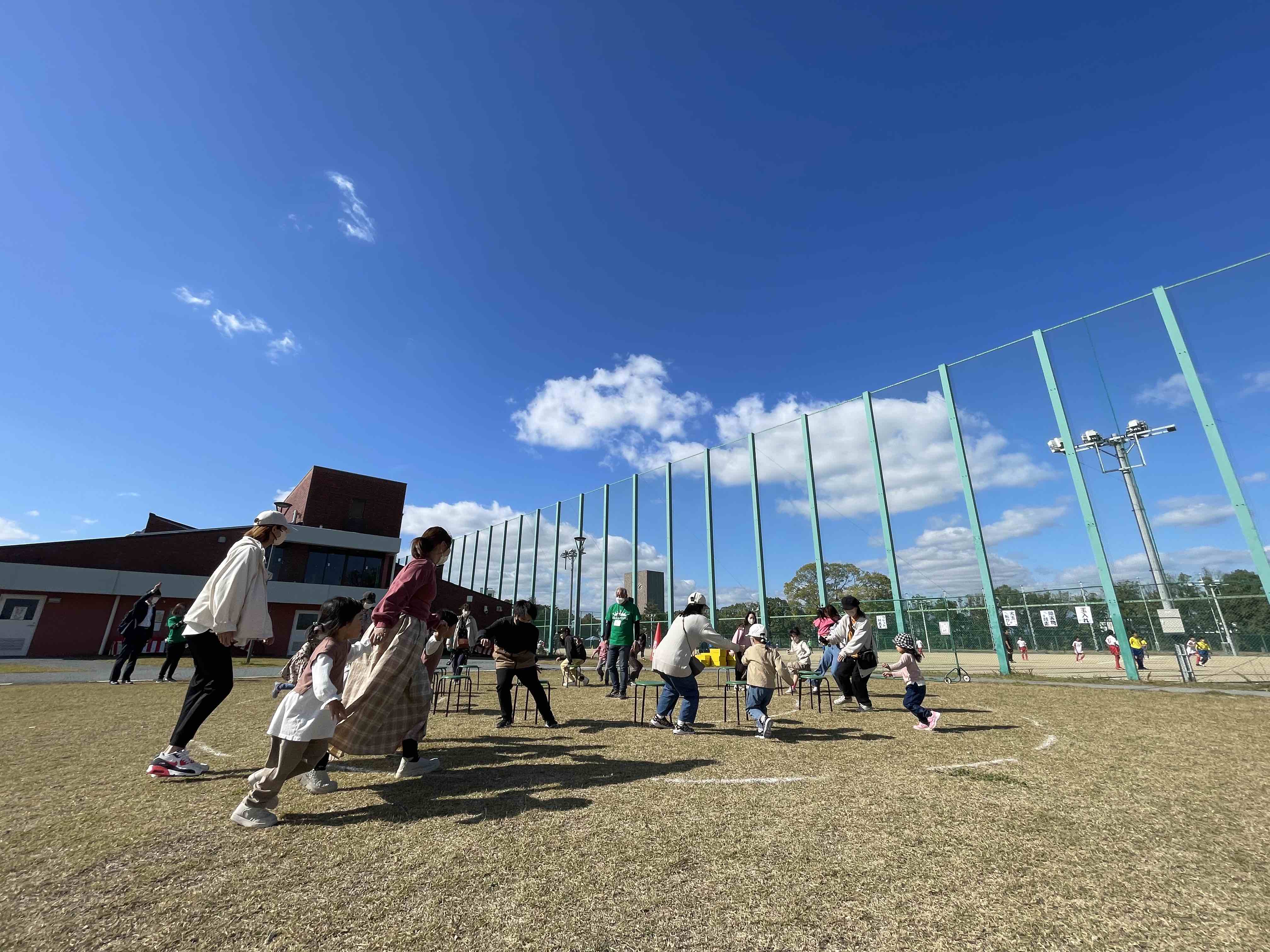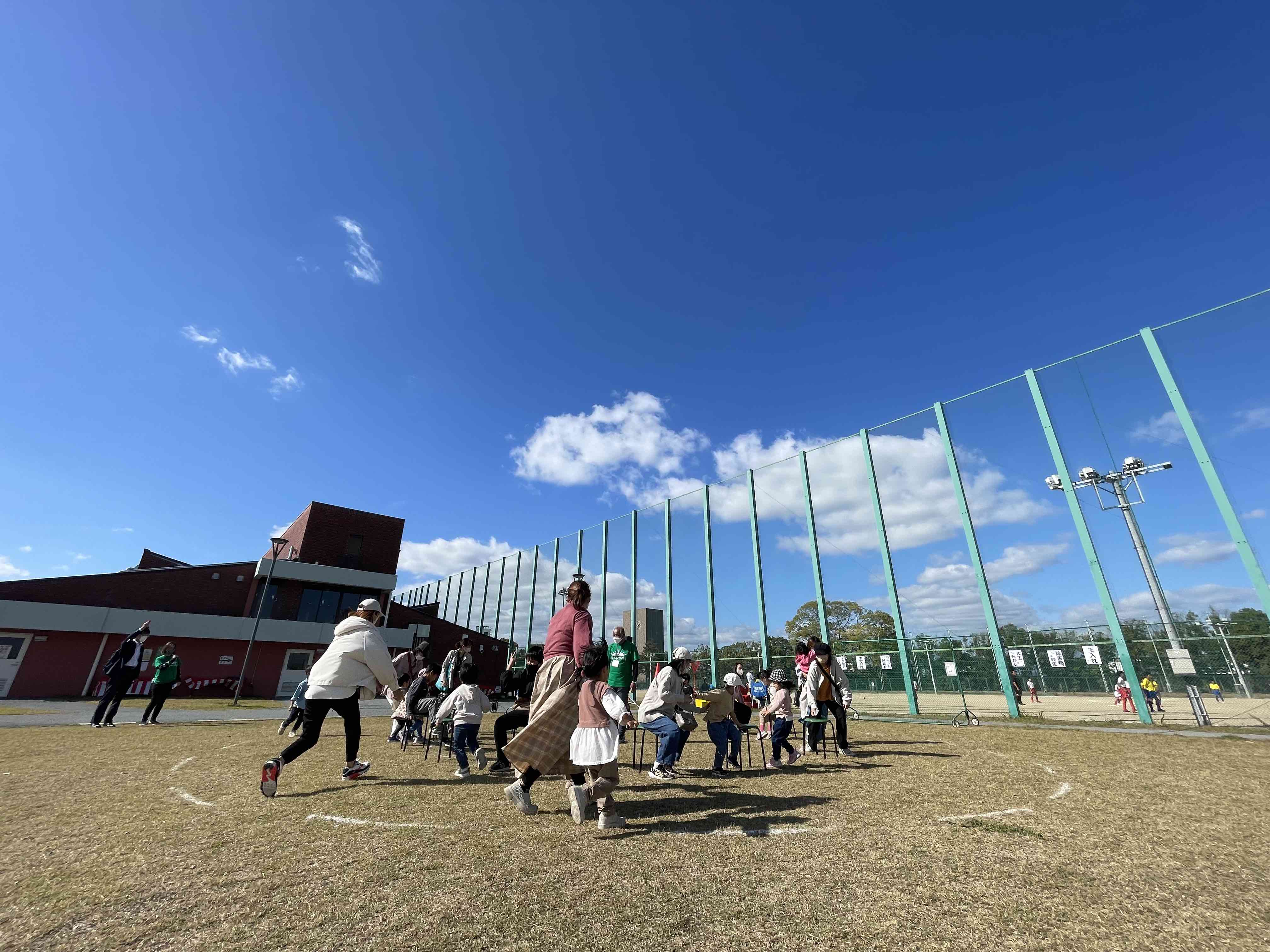 グリスポMAXでの、施設職員一押しのプログラム、「みんな集まれ!グリスポミニ運動会」は、豊中市都市活力部スポーツ振興課の上原課長のご挨拶で開幕。 心地良い秋晴れの元、芝生広場に来場者が続々と集まって、どこか懐メロチックな運動会BGMが流れる中、「椅子取りゲーム」「玉入れ」「大玉転がし」「ラケットリレー」「障害物競争」が行われました。