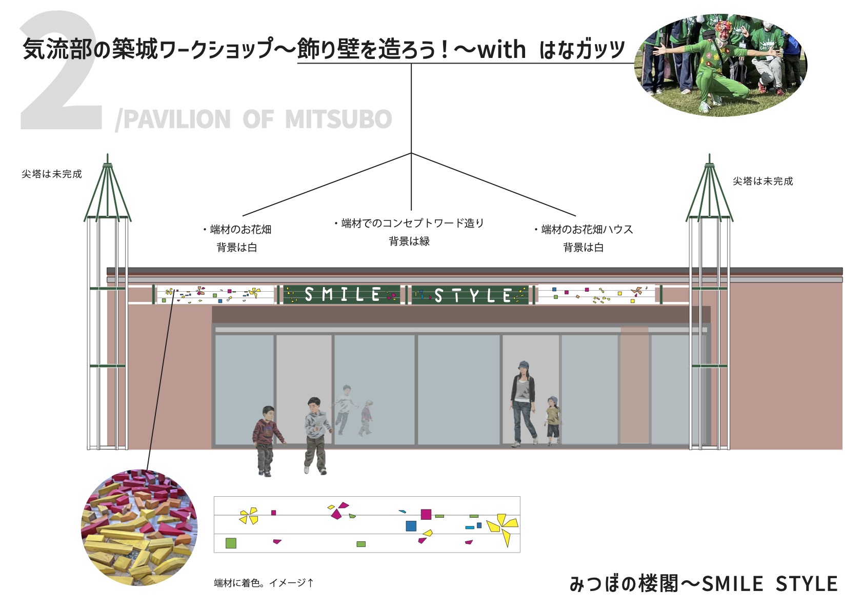 参加者は気流部 with はなガッツの監督のもと、まだ見ぬ完成形をイメージし、楽しく、築城プロセスへの携わりをより実感しながら、また、今後永らく設置される工作物であるという少々のプレッシャーを受けながら、仕上げていきました。
