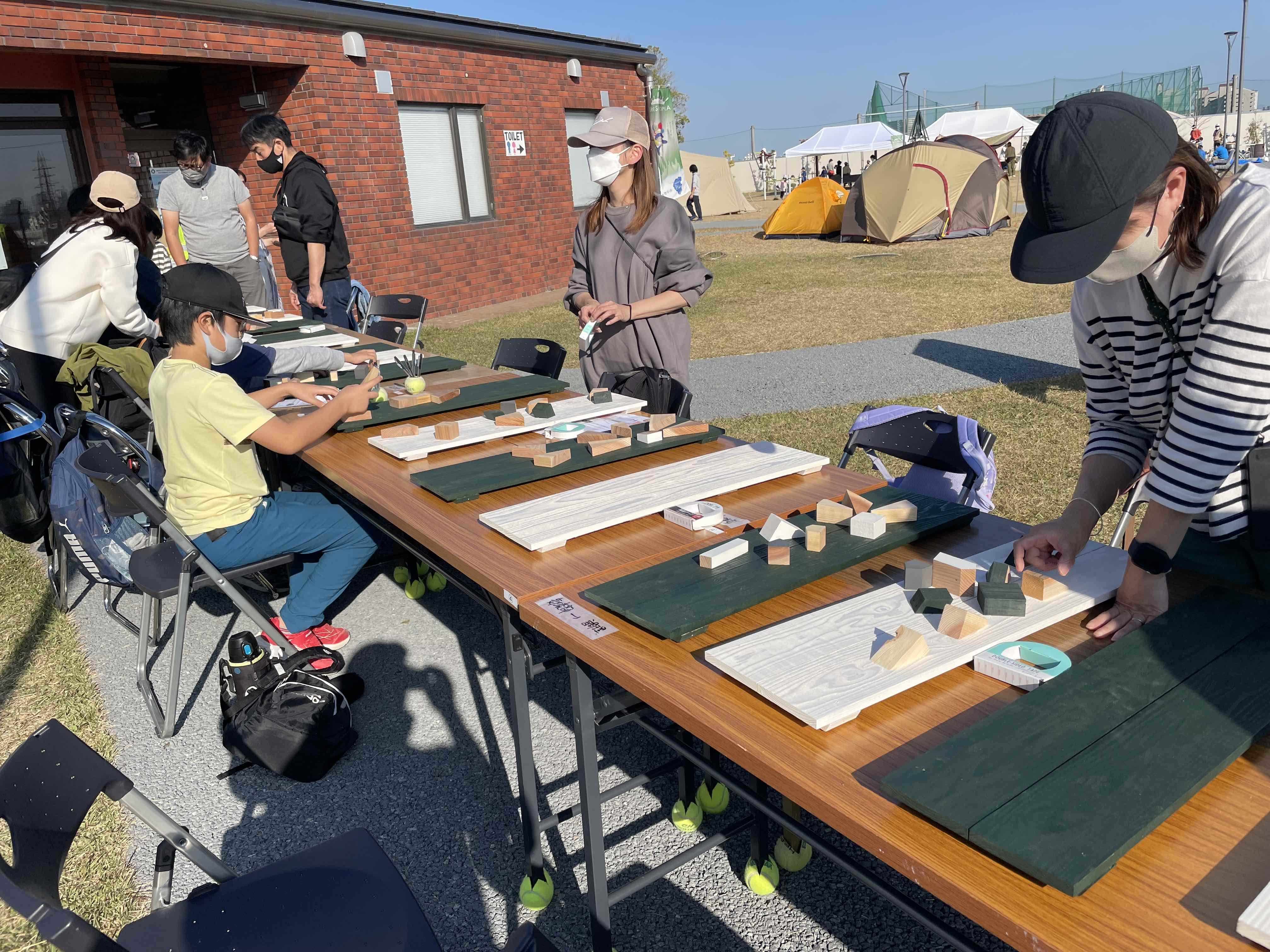 みつぼの花南側、お城の背面が見えるスペースで開催された築城ワークショップは、屋外の開放的な雰囲気の中、第二期の工事を見据えた内容になりました。