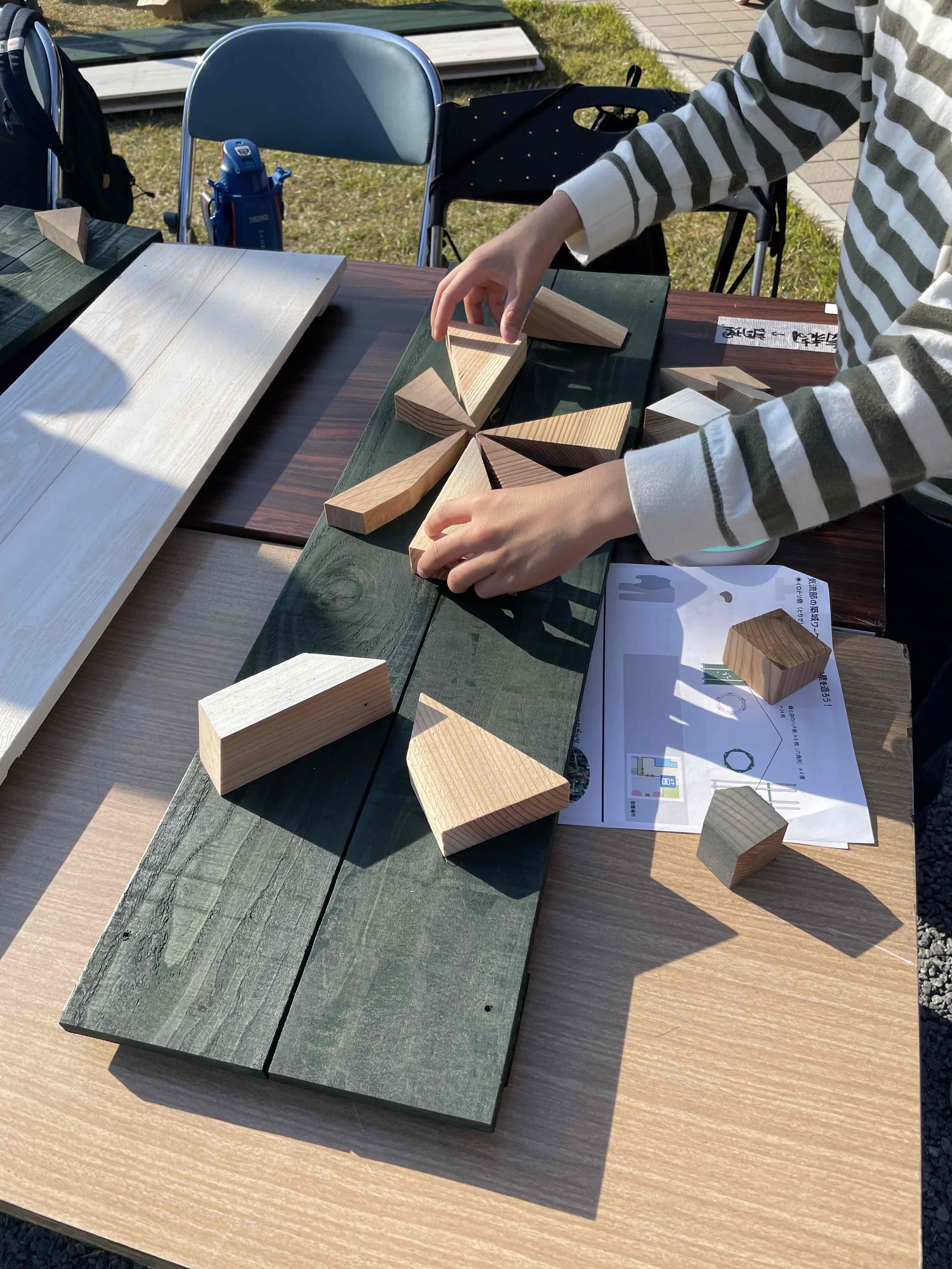 高さ130センチほどの六角形の砦、4塔分のそれぞれの面に、お城の材料である杉材の木端を使い、各自がイメージするお城の文様を作ってもらいました。