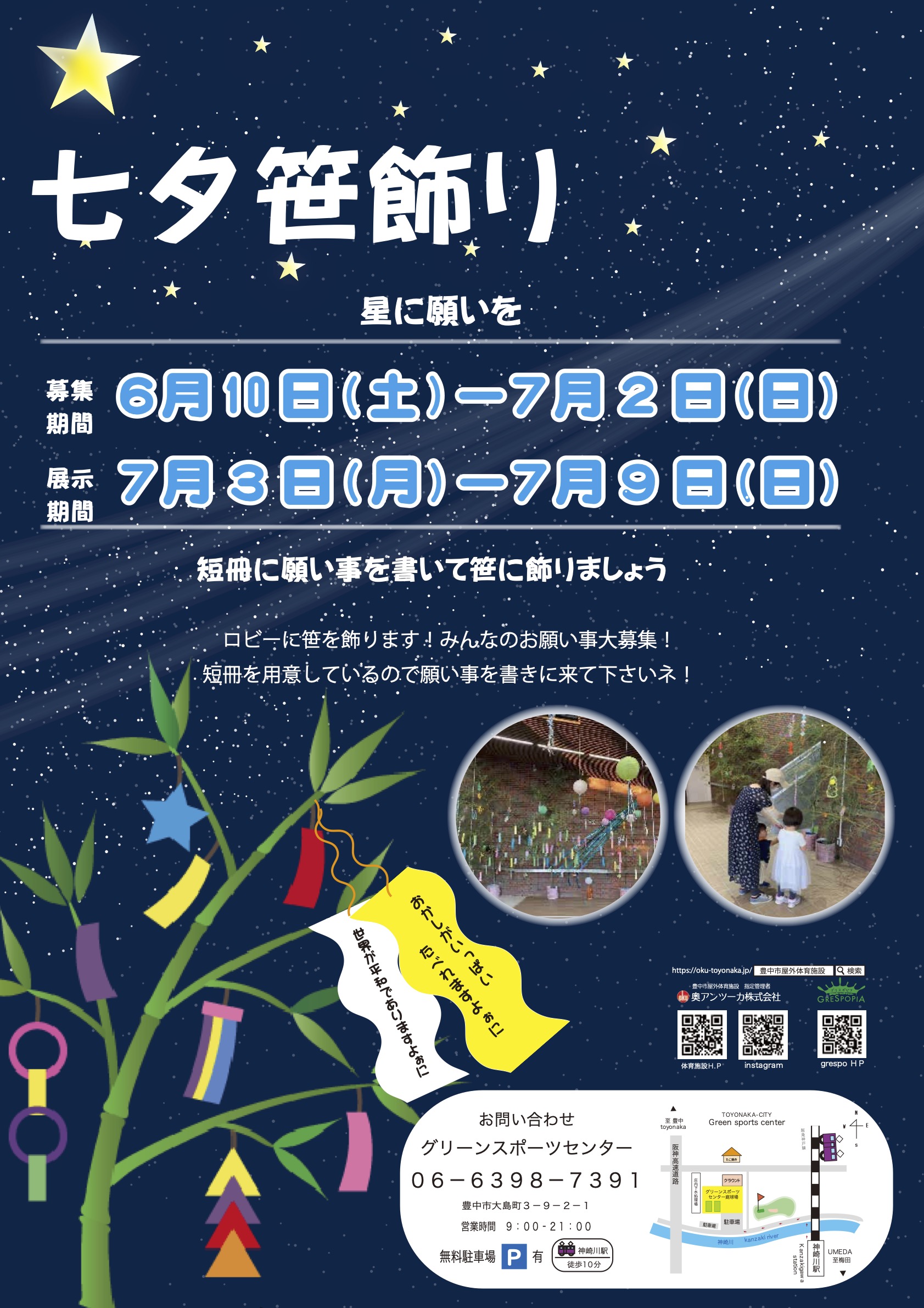 七夕の季節に。 投稿者:Toyonaka_Art_Project2023年6月24日2023年7月17日カテゴリー:イベント、グリスポピア2023、マンスリーイベントタグ:七夕 星に願いを☆ こんにちは、マンスリーイベント担当の竹花です。 梅雨に入り天候不順の折、みなさまにはいかがお過ごしでしょうか。 七夕に向けて、みつぼの花に設置する笹に飾る短冊を募集しています。 まだまだ、みなさまの願いを星にたくさん届けたいのでご来場をお待ちしています! 短冊は受付でお渡ししていますのでお気軽にお声がけください。 【笹の展示期間】 令和5年7月3日(月)~7月9日(日) ◉問い合せ グリーンスポーツセンター 06-6398-7391 豊中市大島町3-9-2-1 天の川、今年は見れるかな Tweetいいね 読み込み中… 関連