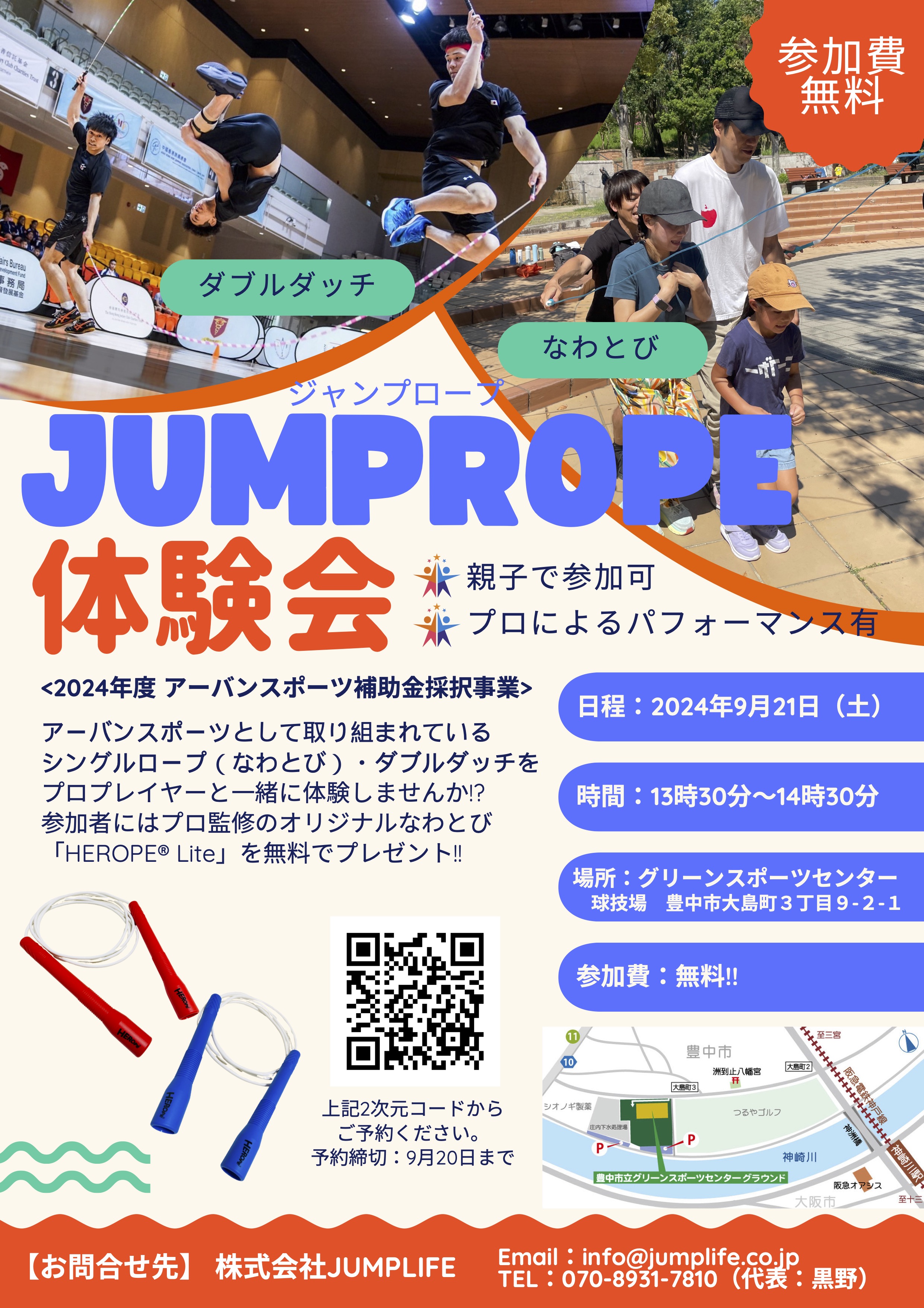 今年から始まりました、アーバンスポーツ推進事業助成金の採択イベントが開催です!昨秋のグリスポピアにも登場した、プロなわとびプレイヤーの黒野選手が代表を務める株式会社JUMPLIFE主催のプログラムです! 「JUMPROPE 体験会」 アーバンスポーツとして取り組まれているシングルロープ(なわとび)・ダブルダッチをプロプレイヤーと一緒に体験しよう! 親子での参加もオッケーです! 【日時】 2024年9月21日(土) 13時30分〜14時30分 【場所】 グリーンスポーツセンターグラウンド 【参加費】 無料 【申込】 チラシ掲載の2次元コードからご予約ください。 【お問合せ】 株式会社JUMPLIFE TEL 070-8931-7810(代表・黒野) Email info@jumplife.co.jp