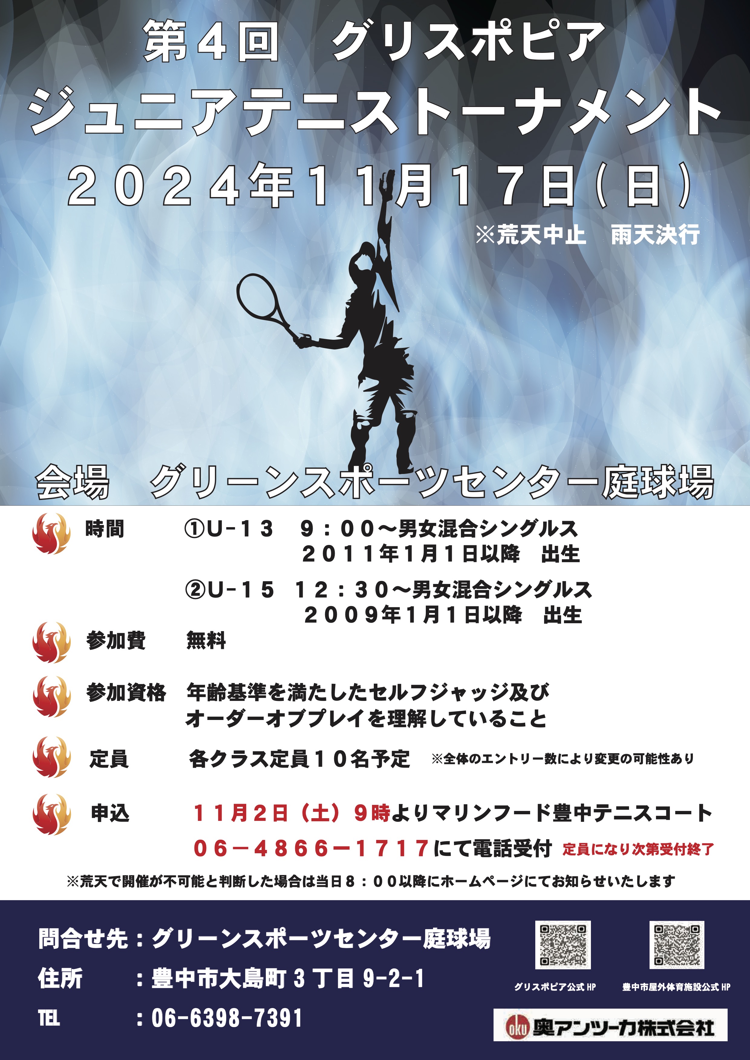 マリンフード豊中テニスコート 06-4866-1717(月~日 9:00~17:00)
