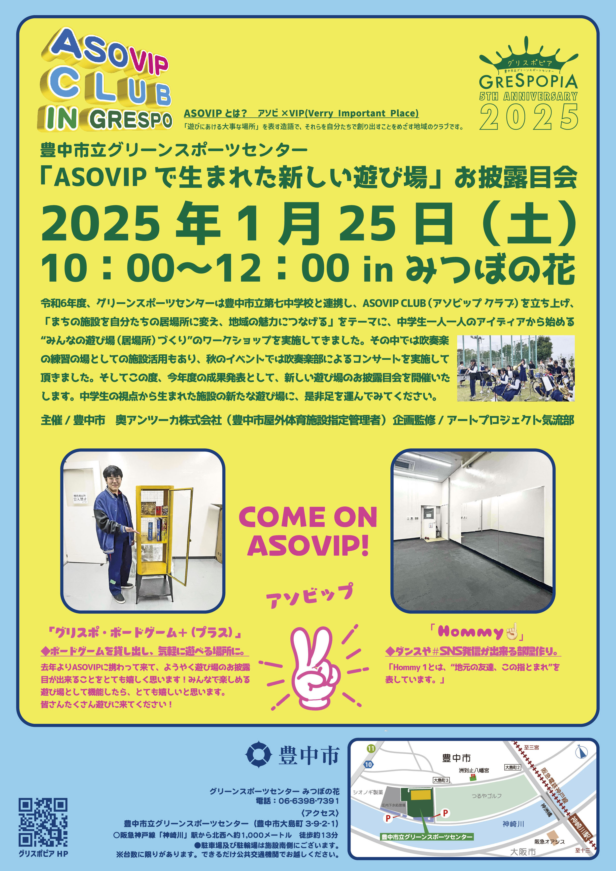 令和6年度、グリーンスポーツセンターは豊中市立第七中学校と連携し、ASOVIP CLUB(アソビップ クラブ)を立ち上げ、「まちの施設を自分たちの居場所に変え、地域の魅力につなげる」をテーマに、中学生一人一人のアイディアから始める“みんなの遊び場(居場所)づくり”のワークショップを実施してきました。