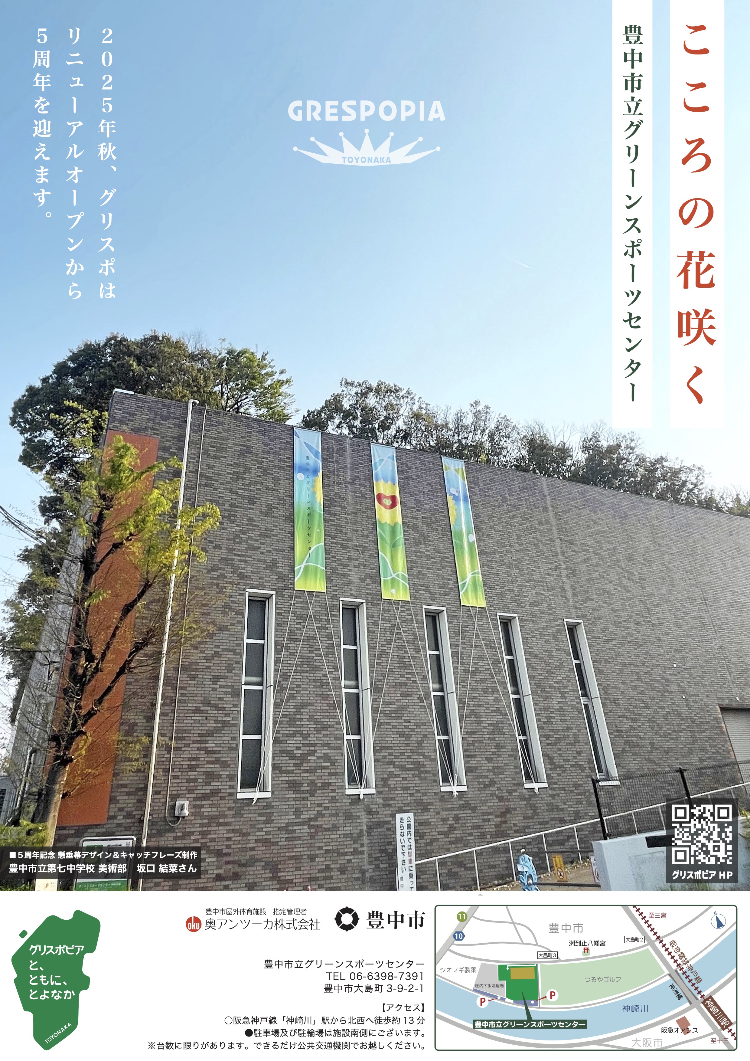 2025年版ポスター完成 投稿者:Toyonaka_Art_Project2025年6月3日2025年6月3日カテゴリー:グリスポピア2025、施設案内タグ:ポスター、懸垂幕 グリスポピア2025のポスターができました!市内の公共スポーツ施設などへ掲示されます。メインビジュアルは先月にも紹介しました、施設北側の懸垂幕のある風景です。晴れやかな青空を背景に、彩り豊かなデザインが印象的な、今年を象徴する一枚です。※懸垂幕については、台風シーズンに入る今月半ばで一旦外し、5周年を迎える秋に再登場する予定です。 Tweetいいね 読み込み中… 関連