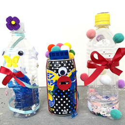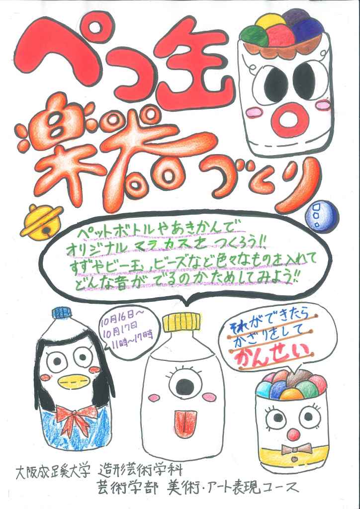 ⚫︎ペッ缶楽器作りワークショップ 開催時間11時〜17時 身近にあるペットボトルや空き缶で、みんながそれぞれの音を作り上げ、オリジナルの楽器にする、セルフ型造形ワークショップを開催!マイぺっ缶楽器を持って、音大オープンマイクに参加しよう!