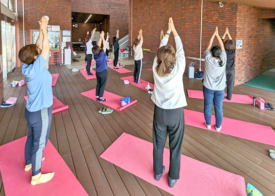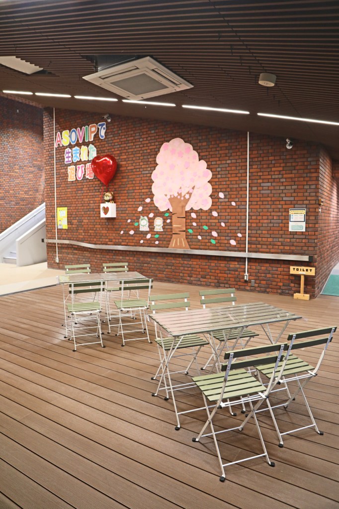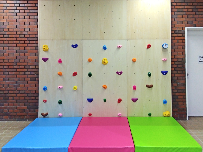 休憩スペースとして、また、ヨガや健康体操のエクササイズ教室やイベントスペース、夏場はクール自習室として活用され、エントランスフロアーの左奥の壁面には「キッズボルタリング」(※3歳〜6歳向け)が設置されています。